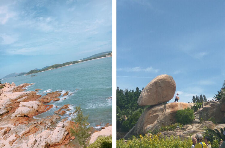 東山島,別稱陵島,形似蝴蝶亦稱蝶島,風(fēng)動(dòng)石在關(guān)帝廟附近海濱石崖上,有一塊重約200噸的臨海巨石,狀似玉桃,底部觸地僅數(shù)寸,風(fēng)吹石動(dòng),故名“風(fēng)動(dòng)石”,然而歷經(jīng)臺(tái)風(fēng)、地震而不倒,有“天下第一奇石”之稱