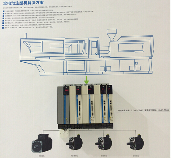 值得關(guān)注的是全電動注塑機(jī)解決方案,此方案采用最新的“書本式”共直流母線的IS810伺服驅(qū)動器, 該伺服驅(qū)動器由整流單元與逆變單元組成。共直流母線結(jié)構(gòu),可節(jié)省大量的安裝空間,整機(jī)共用一個制動系統(tǒng),可減少制動電阻數(shù)量。此次展出的IS810伺服驅(qū)動器包含1個整流模塊和4個逆變模塊,可以接通4臺電機(jī),分別執(zhí)行注塑機(jī)的射膠、開合、熔膠、頂針動作。整個全電動注塑機(jī)系統(tǒng)采用EtherCAT總線通訊,通訊速率高,接線簡單。針對全電動注塑機(jī)注射動作,匯川技術(shù)推出了ISMQ射膠電機(jī),具有低慣量、快響應(yīng)的特性,從0到額定轉(zhuǎn)速只需10毫秒左右,可完全滿足射膠工藝的需求。
